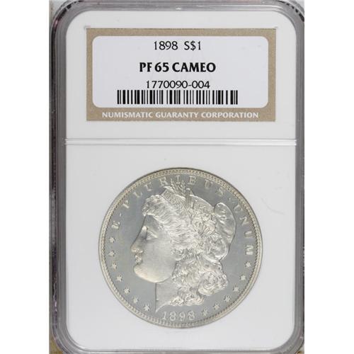 <B>1898 S$1 PR65 Cameo NGC.</B></I> Radiant devices demonstrate obvious contrast with the darkly mirrored fields. The eagle and wreath display especially thick frost. Liberty's cheek and neck are consistently icy, if not quite to the degree needed for an Ultra Cameo designation. Thorough evaluation of the fields beneath a strong lens fails to locate any hairlines. Wisps of milk-gray toning are present on the left obverse field, in the reverse field above the motto, and near the arrowheads. The strike is virtually full, although the naysayer might notice that the hair above Liberty's ear falls just short of a full impression. A scant 735 proofs were struck, and most survivors of this limited production no longer merit consideration as Gem. Census: 8 in 65 Cameo, 16 finer (3/07).<BR><BR><b>Shipping:</b> Coins & Currency (<a target="_blank" href="http://www.heritageauctions.com/common/shipping.php">view shipping information</a>)