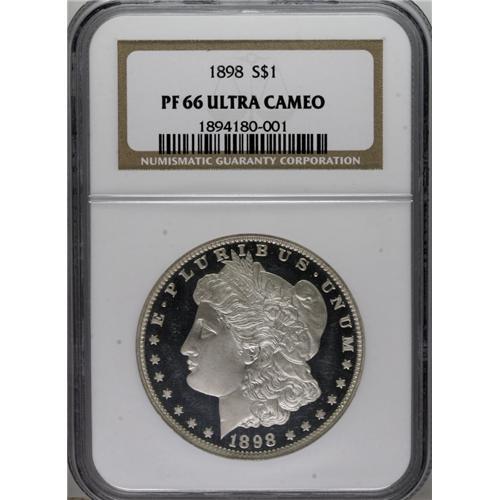 <B>1898 S$1 PR66 Ultra Cameo NGC.</B></I> The remarkable contrast between the fields and devices provides amazing aesthetic appeal. This Premium Gem is fully brilliant with fully white-silver surfaces that exhibit nary a trace of toning. It is only the presence of a few faint hairlines keeps this below the Superb Gem grade level. It is important to realize that some of the "hairlines" are actually on the surface of the plastic holder and reflected in the fields of the coin. The devices have the heaviest imaginable mint frost and the fields have extremely deep mirrors, an amazing white-on-black appearance.<BR><BR><b>Shipping:</b> Coins & Currency (<a target="_blank" href="http://www.heritageauctions.com/common/shipping.php">view shipping information</a>)