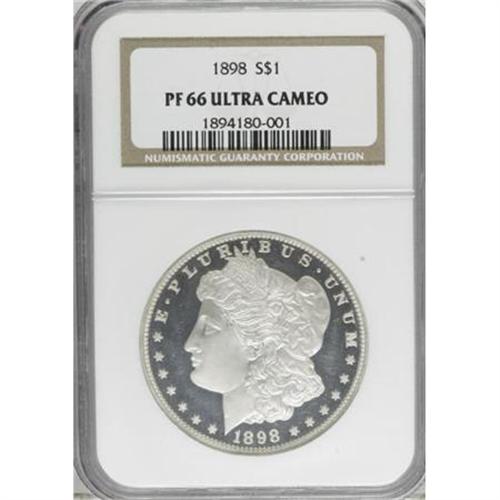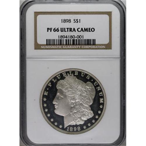 <B>1898 $1 PR66 Deep Cameo NGC.</B></I> The remarkable contrast between the fields and devices provides amazing aesthetic appeal. This Premium Gem is fully brilliant with white-silver surfaces that exhibit nary a trace of toning. It is only the presence of a couple of faint handing marks that keeps this breathtaking specimen below the Superb Gem grade level. The devices have the heaviest imaginable mint frost and the fields have extremely deep mirrors, an amazing white-on-black appearance. A powerful strike imparts crisp definition to the design elements, enhancing even more the coin's outstanding eye appeal.<BR><BR><b>Shipping:</b> Coins & Currency (<a target="_blank" href="http://www.heritageauctions.com/common/shipping.php">view shipping information</a>)