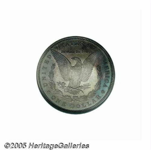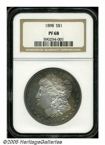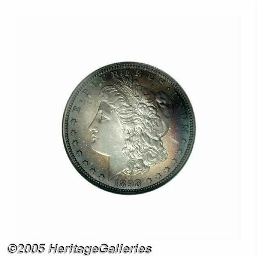 <B>1898<S$1> PR68 NGC.</B></I> A mesmerizing proof Morgan that glitters with near-perfect, mirror surfaces and is literally awash in color, the kind of multihued, iridescent toning that never fails to impress even those with a preference for brilliant coins. Vibrant shades of turquoise-blue circle most of the coin, with areas of deep rose visible at the central regions. The underlying fields show the non-mistakable flash they are well known for. Simply spectacular eye appeal and quality. Population: 8 in 68, 1 finer (5/05).