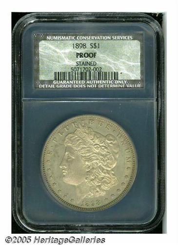 <B>1898<S$1> Proof, Stained, NCS.</B></I> A boldly struck specimen that does not exhibit any highpoint friction above the ear or on the eagle's breast. The dusky apricot-gray color makes less apparent a few faint hairlines in the fields. A scant 735 pieces were struck.