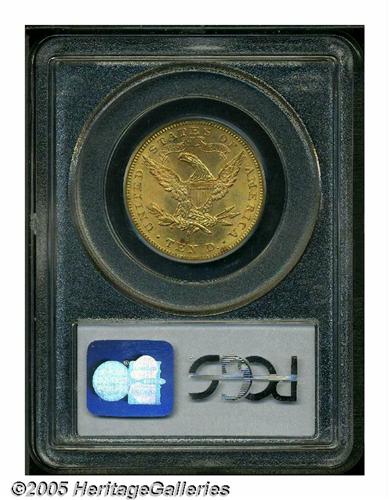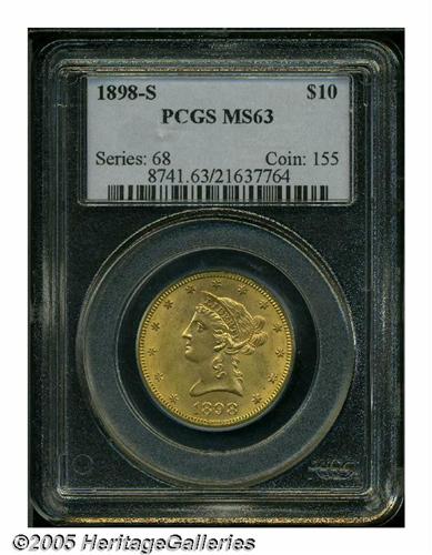 <B>1898-S<$10> MS63 PCGS.</B></I> Sharply struck with virtually all design features boldly and deeply defined save for one or two obverse stars and a few leaves on the reverse olive branch. Fully lustrous and mostly brilliant with some faint blushes of olive-gold iridescence on the obverse. The 1898-S is not particularly scarce as a date in MS60 and lower grades, but certainly elusive and desirable at the MS63 level.