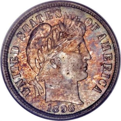 <B>1898-S 10C MS65 PCGS. CAC.</B></I> The 1898-S is another rare series issue in Mint State. This piece is fully detailed, with speckled crimson, amber, and blue highlights on the obverse; the reverse is a mottled russet and jade-green. A single contact mark below the M of DIME rules out an even finer designation. This boldly struck piece is highly elusive in Gem or better grade. Population: 8 in 65, 5 finer (1/08).<BR><I>From The Southwest Collection.</B></I><BR><BR><B>Coin Engraver:</B> Charles E. Barber<BR><BR><b>Shipping:</b> Coins & Currency (<a target="_blank" href="http://www.heritageauctions.com/common/shipping.php">view shipping information</a>)