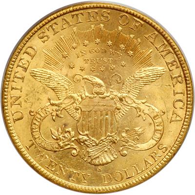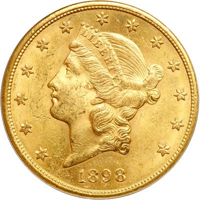 1898-S $20 Liberty. PCGS graded MS-61. Nice golden toning with luster still visible (PCGS # 9034).