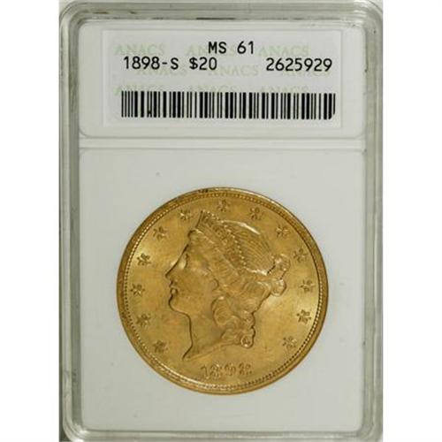 <B>1898-S $20 MS61 ANACS.</B></I> NGC Census: (4595/10515). PCGS Population (2324/8531). Mintage: 2,575,175. Numismedia Wsl. Price for NGC/PCGS coin in MS61: $890. (#9034)<BR><BR><B>Coin Engraver:</B> James B. Longacre<BR><BR><b>Shipping:</b> Coins & Currency (<a target="_blank" href="http://www.heritageauctions.com/common/shipping.php">view shipping information</a>)