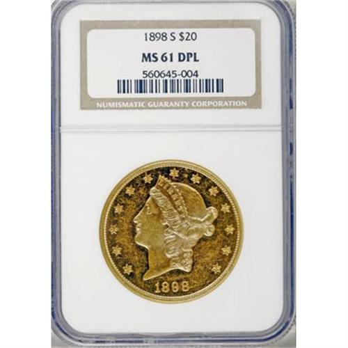 <B>1898-S $20 MS61 Deep Mirror Prooflike NGC.</B></I> The 89 in the date is recut east at the base of the digits. A flashy and meticulously struck example with the expected minor marks throughout the mirrored fields. Population: 2 in 61 Deep Mirror Prooflike, 3 finer. (11/07).<BR><I>From The New York Eye Appeal Collection, Part Three.</B></I><BR><BR><B>Coin Engraver:</B> James B. Longacre<BR><BR><b>Shipping:</b> Coins & Currency (<a target="_blank" href="http://www.heritageauctions.com/common/shipping.php">view shipping information</a>)