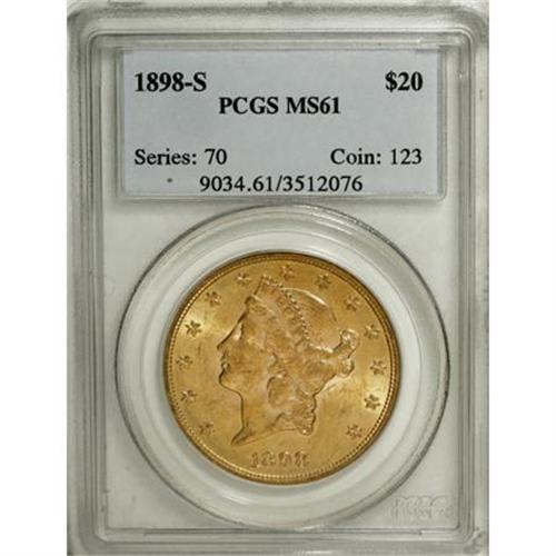 <B>1898-S $20 MS61 PCGS.</B></I> PCGS Population (2324/8531). NGC Census: (4596/10518). Mintage: 2,575,175. Numismedia Wsl. Price for NGC/PCGS coin in MS61: $890. (#9034)<BR><BR><B>Coin Engraver:</B> James B. Longacre<BR><BR><b>Shipping:</b> Coins & Currency (<a target="_blank" href="http://www.heritageauctions.com/common/shipping.php">view shipping information</a>)