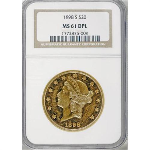 <B>1898-S $20 MS61 Deep Mirror Prooflike NGC.</B></I> The impressively mirrored fields contrast nicely with the frosty motifs. The obverse field has its share of small marks, but none merit individual mention. Census: 2 in 61 Deep Mirror Prooflike, 3 finer (11/07).<BR><I>From The New York Eye Appeal Collection, Part Three.</B></I><BR><BR><B>Coin Engraver:</B> James B. Longacre<BR><BR><b>Shipping:</b> Coins & Currency (<a target="_blank" href="http://www.heritageauctions.com/common/shipping.php">view shipping information</a>)