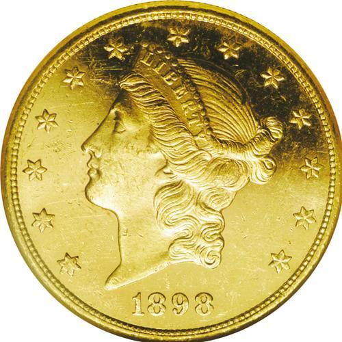 <B>1898-S<$20> MS62 Deep Mirror Prooflike NGC.</B></I> An unusually mirrored business strike that was presumably among the first pieces struck from a newly installed pair of dies. Cameo contrast is evident between the major devices and the flashy fields. A few faint obverse hairlines are found beneath a loupe, and the distributed light field marks are typical of the MS62 grade. Census: 2 in 62 Deep Mirror Prooflike, 1 finer (4/06).