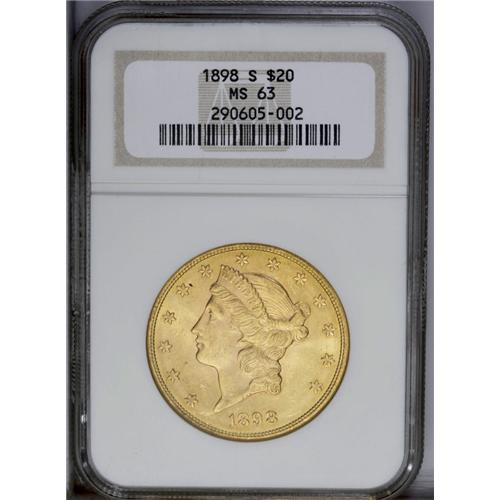 1898-S $20 MS63 NGC. A crisply struck piece with highl