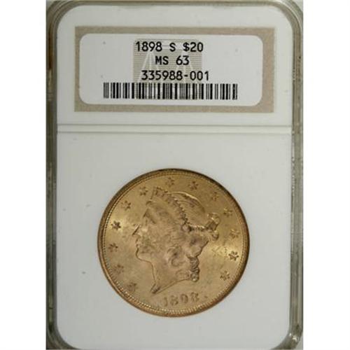 <B>1898-S $20 MS63 NGC.</B></I> . NGC Census: (2929/998). PCGS Population (2483/1142). Mintage: 2,575,175. Numismedia Wsl. Price for NGC/PCGS coin in MS63: $1,350. (#9034)<BR><BR><B>Coin Engraver:</B> James B. Longacre<BR><BR><b>Shipping:</b> Coins & Currency (<a target="_blank" href="http://www.heritageauctions.com/common/shipping.php">view shipping information</a>)
