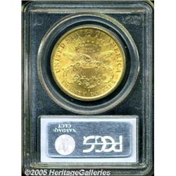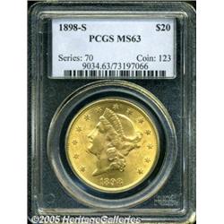 <B>1898-S $20 MS63 PCGS.</B></I> Intense luster radiates from peach-gold surfaces, and the design features are well struck, though a touch of softness is apparent in portions of Liberty's hair. Liberty's cheek and neck, and the remaining obverse surfaces display a few trivial, but grade-limiting marks.