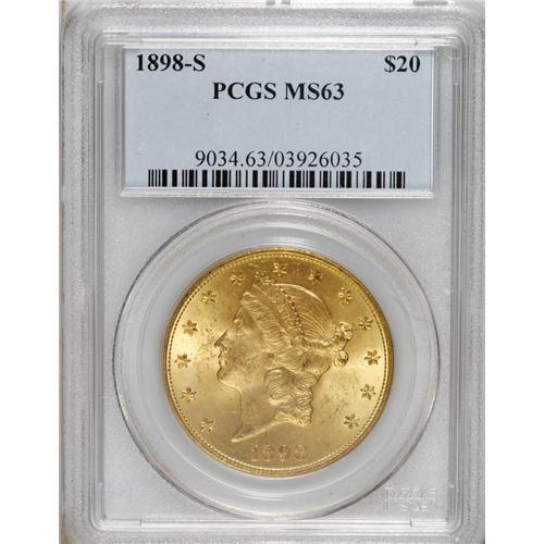 1898-S $20 MS63 PCGS. Peach devices are encompassed by