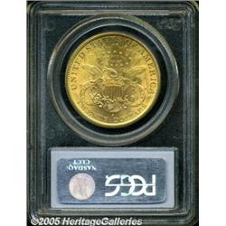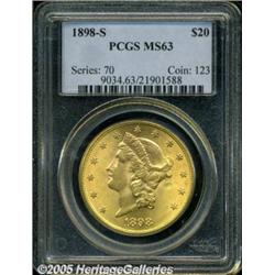 <B>1898-S $20 MS63 PCGS.</B></I> Perhaps conservatively graded, this boldly struck example has bright, shimmering luster and lovely pink and yellow-gold toning. The obverse and reverse surfaces are virtually unmarked, while minor striking incompleteness is noted on three or four of the obverse stars.