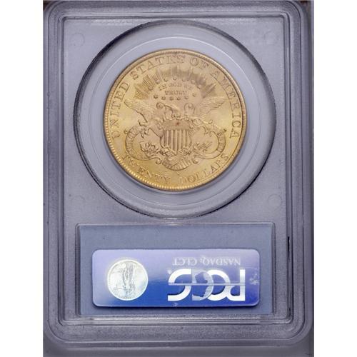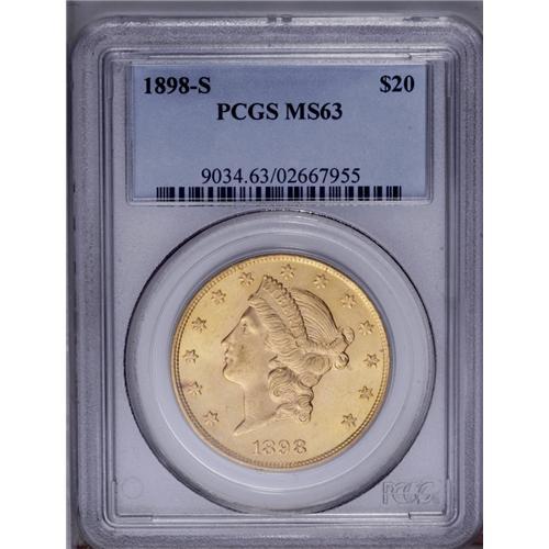 <B>1898-S $20 MS63 PCGS.</B></I> The appearance is high-end for the grade with few visible marks and flashy luster. Kept from a finer grade by incompleteness in some of the peripheral stars and several light slide marks running diagonally across the obverse surfaces.