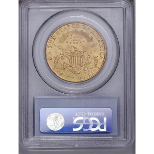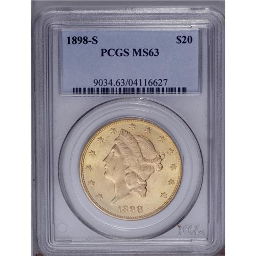 <B>1898-S $20 MS63 PCGS.</B></I> This issue has the largest S-mint coinage of the 1890s, ensuring a steady supply of high-quality survivors. The present example has delightfully clean green-gold surfaces with ebullient cartwheel luster. The coin overall is remarkably free of heavy abrasions, but a few of the peripheral stars are softly struck in the center. Highly appealing.