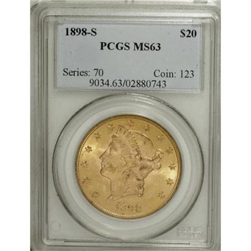 <B>1898-S $20 MS63 PCGS.</B></I> PCGS Population (2425/1105). NGC Census: (2899/972). Mintage: 2,575,175. Numismedia Wsl. Price for NGC/PCGS coin in MS63: $1,025. (#9034)<BR><BR><B>Coin Engraver:</B> James B. Longacre<BR><BR><b>Shipping:</b> Coins & Currency (<a target="_blank" href="http://www.heritageauctions.com/common/shipping.php">view shipping information</a>)