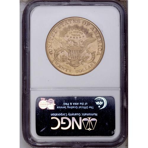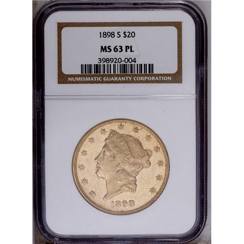 <B>1898-S $20 MS63 Prooflike NGC.</B></I> The flashy fields are moderately abraded, but bagmarks are nearly absent on the portrait. The date shows repunching on the base of the 1, the ball of the 9, and within the upper inner loop of the final 8. Census: 7 in 63 Prooflike, 0 finer (12/05).