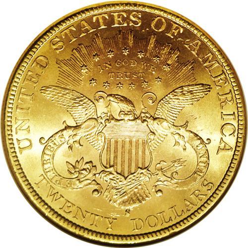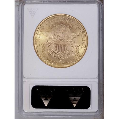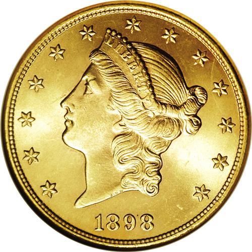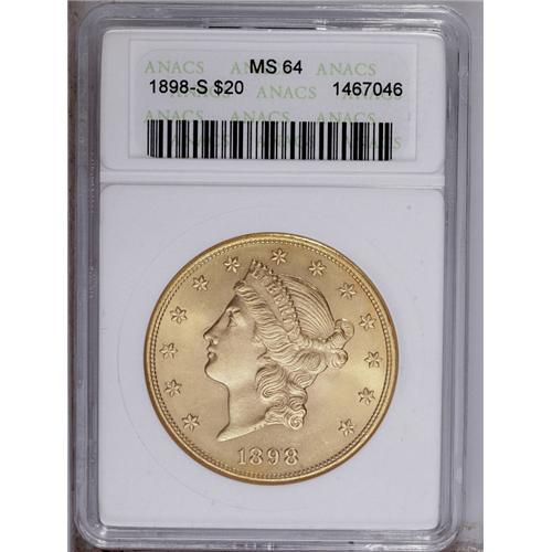 <B>1898-S $20 MS64 ANACS.</B></I> As is the case with the majority of later date San Francisco Liberty Double Eagle issues, the 1898-S is available in bagmarked Mint State condition. However, due to years of indifferent storage as bullion, those pieces without numerous detracting abrasions are relatively scarce. This lovely near-Gem possesses its full original luster, and the cheek and fields are clean even for the designated grade.