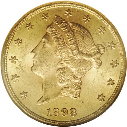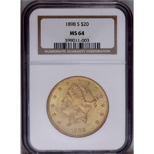 <B>1898-S $20 MS64 NGC.</B></I> Frosty and lustrous for this issue, and with Choice surfaces. As nice as this date is readily encountered, and always popular as these late 1890s issues were well made by the mints. Minor scuffs from the coveted Gem grade, but attractive for the grade.