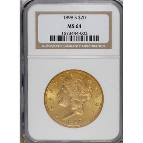 <B>1898-S $20 MS64 NGC.</B></I> Stars 7 to 10 are a bit soft, but the overall strike is sharp. This yellow-gold Choice Liberty twenty has pleasing luster and clean surfaces. The obverse is especially free from consequential contact.<BR><BR><b>Shipping:</b> Coins & Currency (<a target="_blank" href="http://www.heritageauctions.com/common/shipping.php">view shipping information</a>)