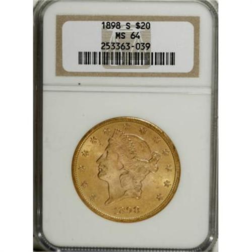 <B>1898-S $20 MS64 NGC.</B></I> A highly pleasing near-Gem with good delineation on the design features. Apricot-gold surfaces are radiantly lustrous, and are just handful of marks away from full Gem status.<BR><BR><B>Coin Engraver:</B> James B. Longacre<BR><BR><b>Shipping:</b> Coins & Currency (<a target="_blank" href="http://www.heritageauctions.com/common/shipping.php">view shipping information</a>)