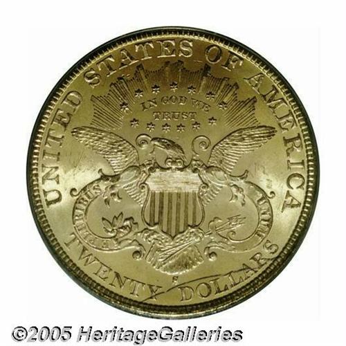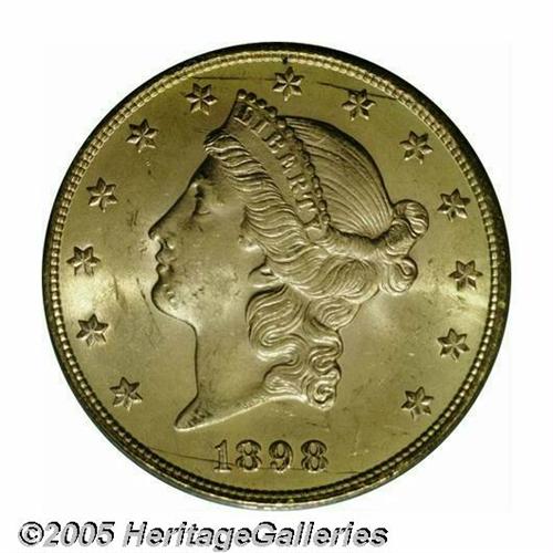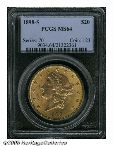 <B>1898-S<$20> MS64 PCGS.</B></I> A lustrous near-Gem with bright yellow-gold color and a bold strike. Impressively preserved, and of interest to both specialists and type collectors. Two thin dark marks of unknown origin are seen at the base of the obverse through the date and at the top of the same side.