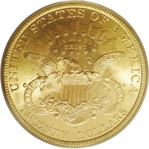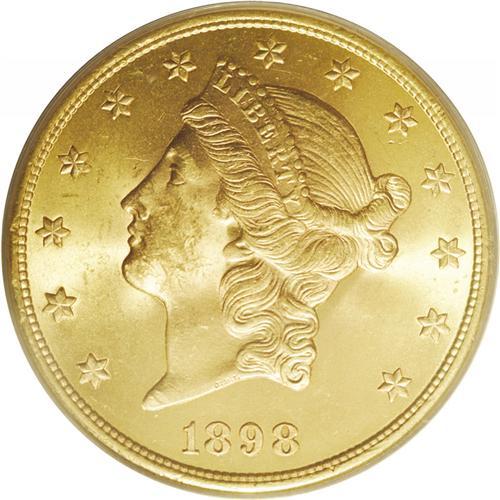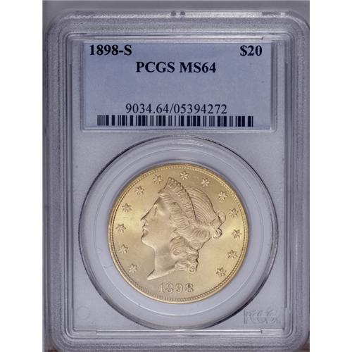 <B>1898-S $20 MS64 PCGS.</B></I> An exquisite near-Gem example with frosty yellow luster and wisps of pinkish color. Only the slightest scuffs keep this from the MS65 grade level.
