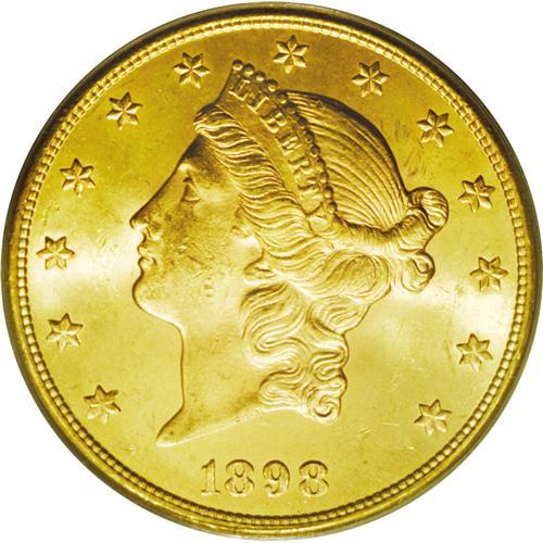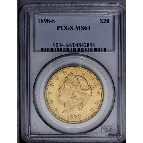 <B>1898-S<$20> MS64 PCGS.</B></I> This is a gorgeous near-Gem example that has certain attributes of a higher grade. The surfaces are fully lustrous and frosty with brilliant yellow-gold color and traces of pink toning on the reverse. It is sharply struck with a creamy gold appearance. This date is generally considered the second commonest of all San Francisco Mint Liberty double eagles. <BR><BR><B>Important notice:</B> Heritage usually auctions material at the rate of 200-250 lots per hour. On some occasions eBay Live bid software or the Internet may not be able to keep up with the pace of the auction. We recommend placing a realistic absentee bid now as insurance to avoid disappointment. Occasionally the auctioneer may eliminate or reject an eBay Live bid, and the auctioneer may also reopen a lot after the close of the eBay live bidding (usually because we missed an audience bid), and may reject your bid even if it shows you as the winning bidder. By bidding via eBay Live, you agree that Heritage may award the lot to another bidder at its sole discretion under the circumstances described above or any other reasonable circumstances. Since eBay bids are not shown to us until we open the lot on the floor, we treat those bids just like floor bids. In most cases the floor responds before the eBay bid is presented to us, due to Internet lag time, so for consistency we have made it a policy that floor bids are always considered first over tie eBay live bids. Also please note that all Heritage lots purchased through eBay Live carry a 20% Buyer's Premium. Please make sure you read the Terms and Conditions before you bid. This lot is being auctioned in conjunction with a live floor auction by Heritage Galleries & Auctioneers. All final auction and invoice information will be supplied by Heritage Galleries & Auctioneers, and all other information should be considered preliminary. Lot:4386 <BR><BR><B>Winning Notification and Billing:</B> After the FINAL session in this auction is complete, Heritage will send e-mail and snail mail invoices. This process normally takes several days. All final auction and invoice information will be supplied by Heritage Galleries & Auctioneers, and all other information should be considered preliminary. <BR><BR>This auction will be conducted on a live auction floor and over the Internet through eBay Live. If you choose to place an absentee bid, please take a moment to <font color='#0000ff'><u><a href='http://pages.ebay.com/liveauctions/help/before/laabsentee.html'>learn how eBay Live absentee bidding works</a></u></font><font color='#000000'>