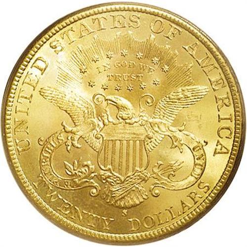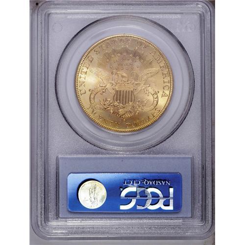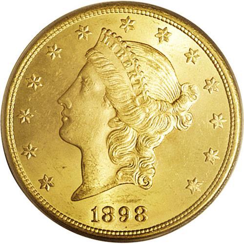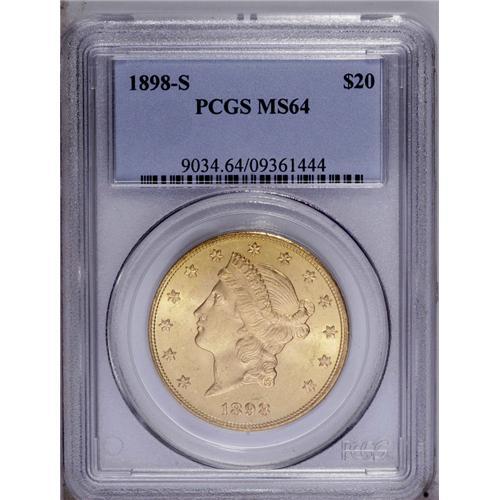 <B>1898-S<$20> MS64 PCGS.</B></I> Well struck and highly lustrous, with lovely mint-green and red-orange toning, and carefully preserved surfaces that are very close to Gem quality. A few wispy marks restrict the grade of this near-Gem. Somewhat scarcer and seldom seen any finer.