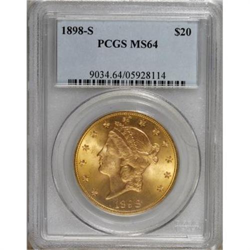 <B>1898-S $20 MS64 PCGS.</B></I> While a large population of this date exists at the MS64 grade level, PCGS has only certified 68 finer pieces. The frosty surfaces are smooth and nearly mark free with highly lustrous yellow and pink-gold color.<BR><BR><b>Shipping:</b> Coins & Currency (<a target="_blank" href="http://www.heritageauctions.com/common/shipping.php">view shipping information</a>)
