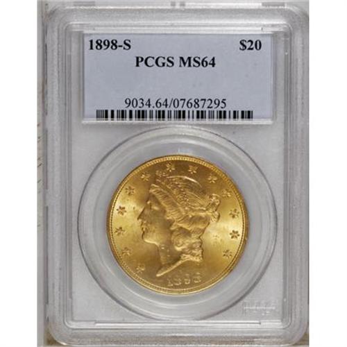 <B>1898-S $20 MS64 PCGS.</B></I> This near-Gem exhibits gorgeous apricot-gold color that shows a glimpse or two of green on the reverse. The design features are boldly struck, and just a few minor scuffs prevent a higher grade. An attractive example of this higher-mintage West Coast issue.<BR><BR><B>Coin Engraver:</B> James B. Longacre<BR><BR><b>Shipping:</b> Coins & Currency (<a target="_blank" href="http://www.heritageauctions.com/common/shipping.php">view shipping information</a>)