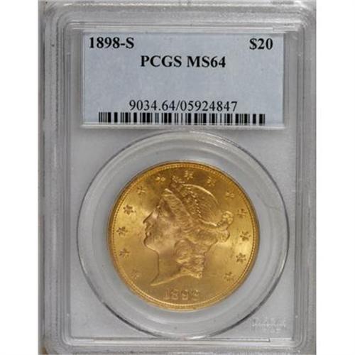 <B>1898-S $20 MS64 PCGS.</B></I> The large mintage (more than 2.575 million pieces) 1898-S double eagle is plentiful in most grades. The lustrous surfaces of this near-Gem example display sharply struck design elements, along with peach-gold patina imbued with hints of light green. A small, shallow scratch is noted above the 98 of the date.<BR><BR><B>Coin Engraver:</B> James B. Longacre<BR><BR><b>Shipping:</b> Coins & Currency (<a target="_blank" href="http://www.heritageauctions.com/common/shipping.php">view shipping information</a>)