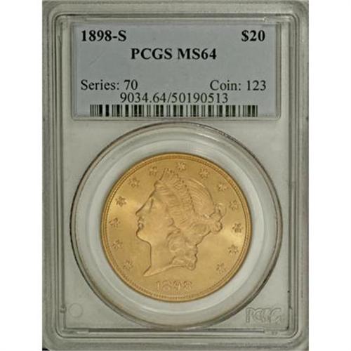 <B>1898-S $20 MS64 PCGS.</B></I> Both sides yield pleasing luster and yellow-gold patination tinted with light tan. A well executed strike imparts sharp definition to the design features, and well preserved surfaces reveal just a few minute contact marks.<BR><BR><B>Coin Engraver:</B> James B. Longacre<BR><BR><b>Shipping:</b> Coins & Currency (<a target="_blank" href="http://www.heritageauctions.com/common/shipping.php">view shipping information</a>)
