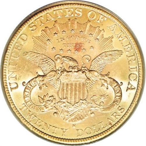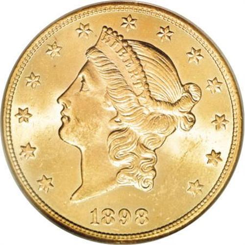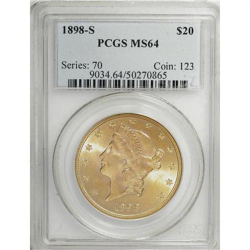 <B>1898-S $20 MS64 PCGS.</B></I> This is a high-mintage issue which is easily available at most grade levels up to and including MS64. The certified population figures plummet at the Gem level, however; and there are more than 10 times as many pieces graded at the near-Gem level as there are at MS65 (at NGC and PCGS combined). This example is highly lustrous and very attractive. A typical number of small marks are noted, along with a shallow scrape in the lower right obverse field. A red-orange alloy spot surrounds the S in TRUST. The surfaces present a radiant orange-gold and mint-green appearance. <BR><BR><B>Coin Engraver:</B> James B. Longacre<BR><BR><b>Shipping:</b> Coins & Currency (<a target="_blank" href="http://www.heritageauctions.com/common/shipping.php">view shipping information</a>)