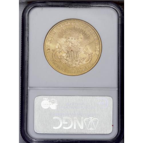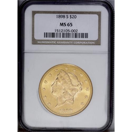 <B>1898-S<$20> MS65 NGC.</B></I> This is one of the most beautiful examples of the 1898-S double eagle that we have ever seen. The shimmering cartwheel luster on each side illuminates absolutely gorgeous deep rose-gold toning. The obverse is nearly pristine, and the reverse is also blemish-free, with a handful of small, scattered red-orange alloy spots that are far from being a significant distraction. This issue is scarce at the Gem level of preservation, and virtually unobtainable any finer. Census: 89 in 65, 6 finer (9/06).
