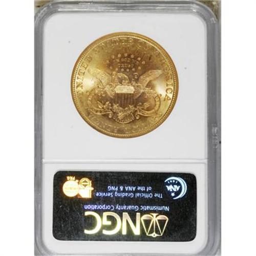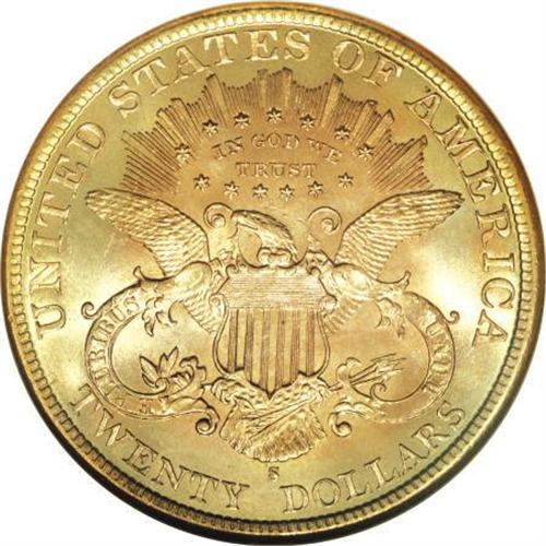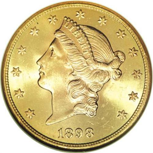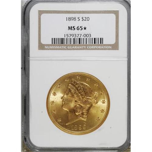<B>1898-S $20 MS65 <img src="/images/star.gif" width="10" height="10" alt="" border="0"> NGC.</B></I> An incredible Gem with amazing orange-gold luster and satin surfaces. The devices are boldly rendered from a full strike. The reverse is accented by hints of pale blue-green toning that lends to the aesthetic appeal. This coin will be fully appreciated by the connoisseur. NGC has only certified six finer examples of the date, as of (2/08).<BR><BR><B>Coin Engraver:</B> James B. Longacre<BR><BR><b>Shipping:</b> Coins & Currency (<a target="_blank" href="http://www.heritageauctions.com/common/shipping.php">view shipping information</a>)