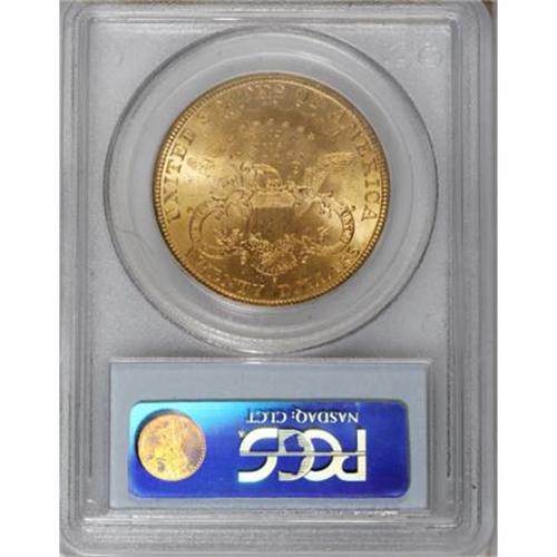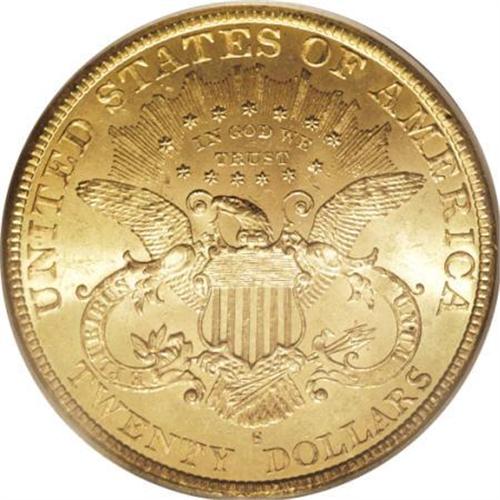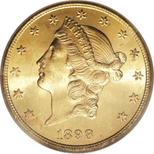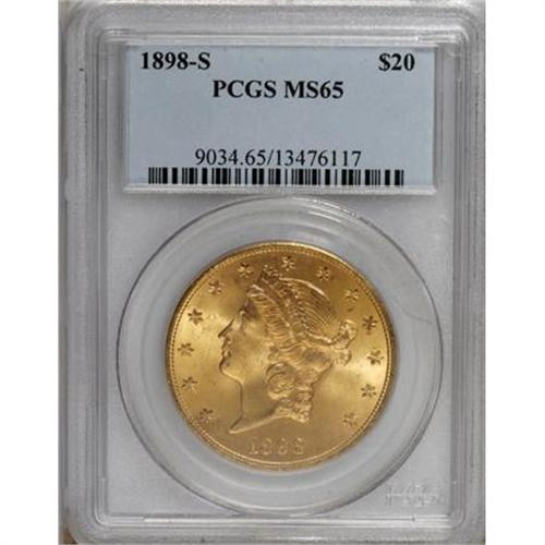 <B>1898-S $20 MS65 PCGS.</B></I> A thoroughly lustrous green-gold Gem with a clean portrait and minimally abraded fields. Only a minuscule percentage of '98-S twenties can compete with the preservation of the present piece. The 89 in the date is lightly recut. Population: 68 in 65, 2 finer (8/07).<BR><BR><B>Coin Engraver:</B> James B. Longacre<BR><BR><b>Shipping:</b> Coins & Currency (<a target="_blank" href="http://www.heritageauctions.com/common/shipping.php">view shipping information</a>)