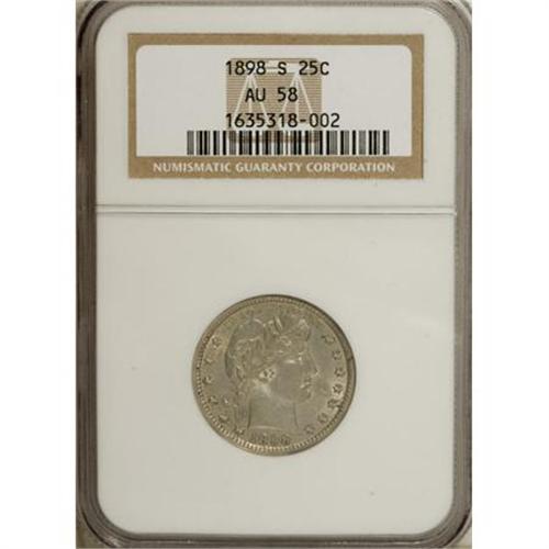 <B>1898-S 25C AU58 NGC.</B></I> NGC Census: (6/28). PCGS Population (7/27). Mintage: 1,020,592. Numismedia Wsl. Price for NGC/PCGS coin in AU58: $283. (#5621)<BR><BR><B>Coin Engraver:</B> Charles E. Barber<BR><BR><b>Shipping:</b> Coins & Currency (<a target="_blank" href="http://www.heritageauctions.com/common/shipping.php">view shipping information</a>\)