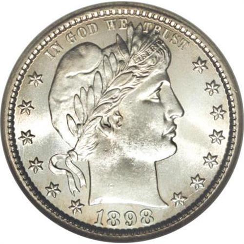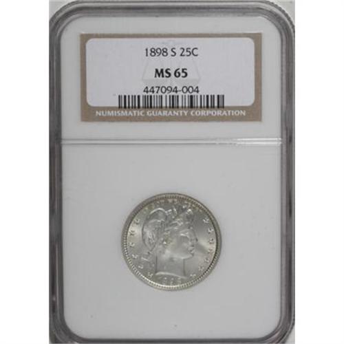 <B>1898-S 25C MS65 NGC.</B></I> David Lawrence and John Feigenbaum in <I>The Complete Guide to Certified Barber Coinage </B></I>call the 1898-S "our new favorite date of the series," adding that it is R.6 in Mint State and that most of the issue made it way to the Philippines, those pieces returning as cleaned, circulated coins. This silvery Gem has satiny luster on both sides complementing the glints of orange, with a full strike and relatively few abrasions. A tiny, undistracting dark spot is noted at the 9 in the date. Census: 7 in 65, 5 finer (1/08).<BR><I>From The Southwest Collection.</B></I><BR><BR><B>Coin Engraver:</B> Charles E. Barber<BR><BR><b>Shipping:</b> Coins & Currency (<a target="_blank" href="http://www.heritageauctions.com/common/shipping.php">view shipping information</a>)