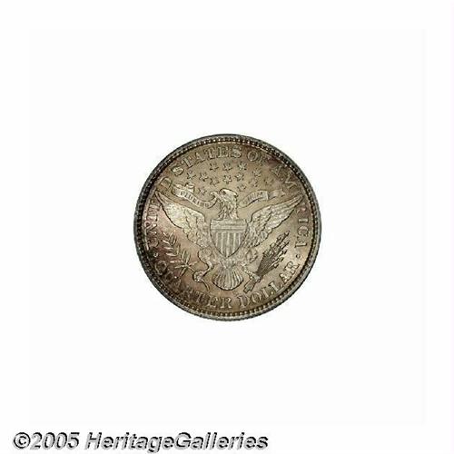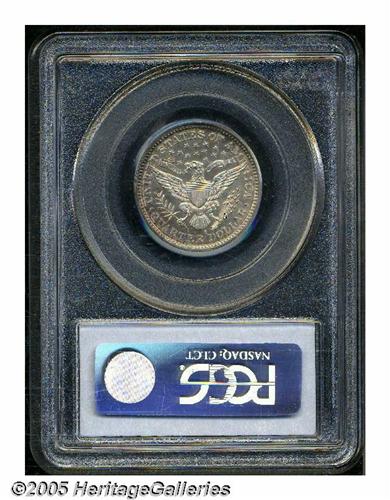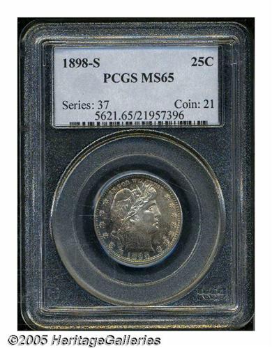 <B>1898-S<25C> MS65 PCGS.</B></I> Widespread circulation around the turn of the 20th century claimed most of the 1,020,592 Quarters produced at the San Francisco Mint in 1898. A prized commodity in problem-free AU, the present Gem warrants significant attention despite competition from the numerous other rarities in the Barber Quarter collection. Predominantly satiny in finish, the surfaces reveal faint cartwheel effects beneath rich golden-violet and turquoise-blue iridescence on the obverse. Both sides are devoid of distracting abrasions. An interesting and rare example. Population: 5 in 65, 1 finer (6/05).