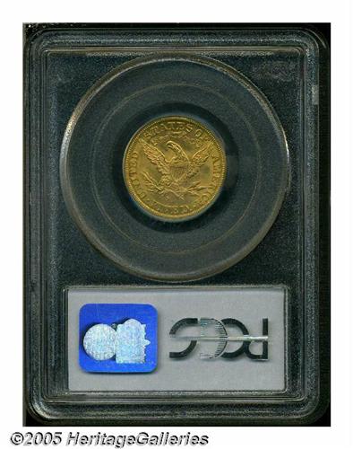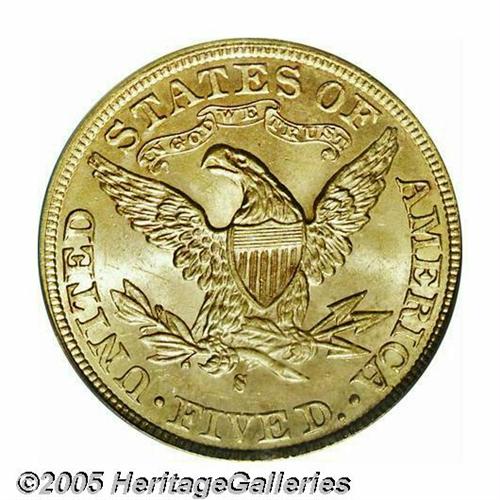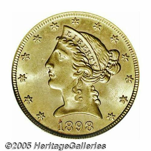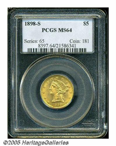 <B>1898-S<$5> MS64 PCGS.</B></I> Although nearly 1.4 million 1898-S Half Eagles were struck, the issue is scarce in Mint State, presumably since gold coins still circulated to an extent in the west because of its traditional preference for hard money. A crisply struck and lustrous yellow-gold near-Gem, both sides are free from obtrusive marks, and the cheek is especially clean. Population: 25 in 64, 6 finer (4/05).