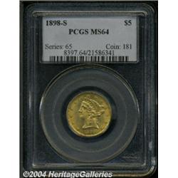 <B>1898-S<$5> MS64 PCGS.</B></I> Although nearly 1.4 million 1898-S half eagles were struck, the issue is scarce in Mint State, presumably since gold coins still circulated to an extent in the west because of its traditional preference for hard money. A crisply struck and lustrous lemon-gold near-Gem, both sides are free from obtrusive marks, and the cheek is especially clean. Population: 20 in 64, 6 finer (3/04). <BR><BR><B>Important notice:</B> Heritage usually auctions material at the rate of 200-250 lots per hour. On some occasions eBay Live bid software or the Internet may not be able to keep up with the pace of the auction. We recommend placing a realistic absentee bid now as insurance to avoid disappointment. Occasionally the auctioneer may eliminate or reject an eBay Live bid, and the auctioneer may also reopen a lot after the close of the eBay live bidding (usually because we missed an audience bid), and may reject your bid even if it shows you as the winning bidder. By bidding via eBay Live, you agree that Heritage may award the lot to another bidder at its sole discretion under the circumstances described above or any other reasonable circumstances. Since eBay bids are not shown to us until we open the lot on the floor, we treat those bids just like floor bids. In most cases the floor responds before the eBay bid is presented to us, due to Internet lag time, so for consistency we have made it a policy that floor bids are always considered first over tie eBay live bids. Also please note that all Heritage lots purchased through eBay Live carry a 20% Buyer's Premium. Please make sure you read the Terms and Conditions before you bid. </span></font></tr></table></td></tr></table>