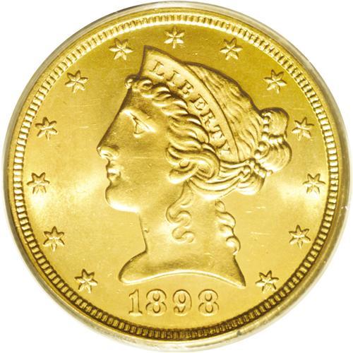 <B>1898-S<$5> MS65 PCGS.</B></I> With a mintage of 1.39 million pieces it is surprising that no more Gems are known of this issue. Almost 200 double eagles have been certified as MS65 by the major services with a mintage that is not quite double that of the half eagle. This is a splendid Gem that displays bright, shimmering surfaces and whose fields are borderline reflective. Fully struck in all areas with even, medium gold coloration. A conditionally important example of this late-date five dollar Liberty. Population: 4 in 65, 3 finer (7/06).