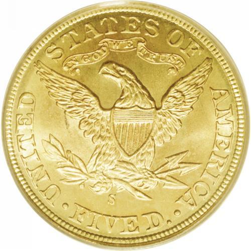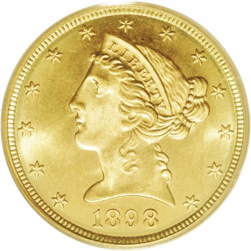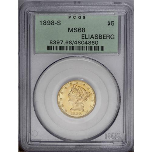 <B>1898-S<$5> MS68 PCGS.</B></I> Ex: Eliasberg. This is an incredible example from the famous Louis E. Eliasberg, Sr. Collection, sold by Bowers and Ruddy in 1982. In these days of numismatic conservation, it is truly refreshing to see a coin like this, that has unquestionably original color and surfaces. Since the day it was struck, this Superb Gem has never been cleaned or enhanced in any manner. The brilliant yellow-gold surfaces have rich green patina near the borders, gradually blending to pinkish-orange color and rich honey toning. A short curved grease stain on the reverse remains from the time this beauty was struck. Although not absolutely perfect (for it is not graded 70), the surfaces are pristine and virtually free of any abrasions. In his 1982 catalog for the Eliasberg Collection, Dave Bowers commented: "[A] sparkling, glittering, coruscating half eagle. Obviously a very special coin, a 'specimen' reserved at the time of mintage." It is a rare coin, indeed, that maintains a continuous pedigree literally back to the day it was made, and an especially rare circumstance when such a coin is from any of the branch mints.<BR> Show us another one. In addition to this PCGS certified MS68, a single submission appears in the NGC Census at this same grade level. We would like to see that coin, for we can't imagine it to be any finer than the present Eliasberg Collection specimen. In fact, we find it difficult to believe that such a coin even exists, and would like very much to see it. It is our belief that this amazing Superb Gem example is the single finest known 1898-S Half Eagle.<BR><I>Ex: United States Mint; J.M. Clapp (who bought it from the Mint for face value); John H. Clapp; Clapp Estate; Louis E. Eliasberg, Sr. (Bowers and Ruddy, 10/1982), lot 597.</B></I><BR><I>From The Larj Collection.</B></I>