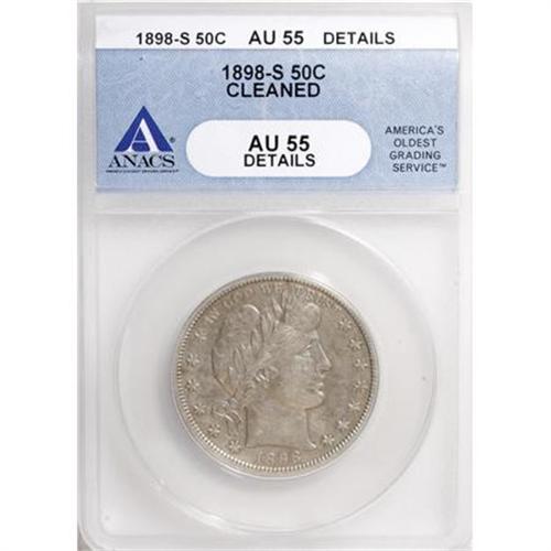 <B>1898-S 50C --Cleaned--ANACS. AU55 Details.</B></I> NGC Census: (3/49). PCGS Population (12/41). Mintage: 2,358,550. Numismedia Wsl. Price for NGC/PCGS coin in AU55: $467. (#6482)<BR><BR><B>Coin Engraver:</B> Charles E. Barber<BR><BR><b>Shipping:</b> Coins & Currency (<a target="_blank" href="http://www.heritageauctions.com/common/shipping.php">view shipping information</a>)