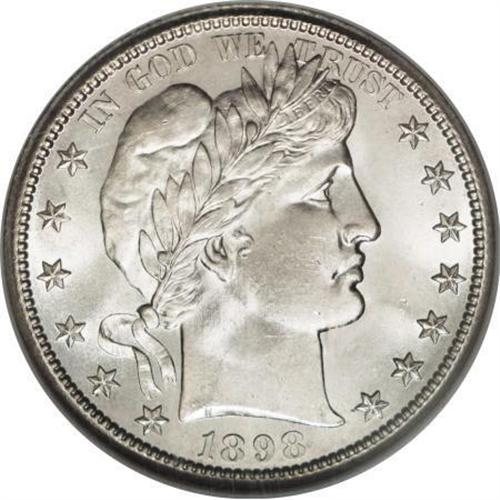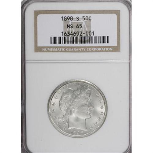 <B>1898-S 50C MS65 NGC.</B></I> This is a lovely, ice-white Gem of this difficult issue, with radiant cartwheel luster that any Morgan dollar would be proud of. There is no discernible color on either side, and relatively few contact marks appear on the surfaces. Localized strike weakness shows as a small patch of roller marks under a loupe on Liberty's cheek, and on the opposite side at the right shield corner. Elsewhere the strike is bold and pleasing, and this piece nonetheless offers generous eye appeal for those who prefer untoned coins. Census: 6 in 65, 3 finer (1/08).<BR><I>From The Southwest Collection.</B></I><BR><BR><B>Coin Engraver:</B> Charles E. Barber<BR><BR><b>Shipping:</b> Coins & Currency (<a target="_blank" href="http://www.heritageauctions.com/common/shipping.php">view shipping information</a>)