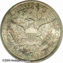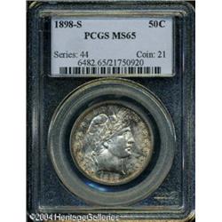 1898-S 50C MS65 PCGS. A large percentage of the Ha <B>1898-S 50C MS65 PCGS.</B></I> A large percentage of the Half Dollar production at the San Francisco mint during the last few years of the 19th century was exported to the Philippines after the successful conclusion of the Spanish-American War. This is one reason why issues such as the 1898-S are especially difficult in Mint State grades. Offered here is an uncommonly high grade representative that is colorfully toned in mottled russet and blue hues, and displays a glimmering, semi-reflective sheen throughout. Population: 6 in 65, 5 finer (10/04). <BR><BR><B>Important notice:</B> Heritage usually auctions material at the rate of 200-250 lots per hour. On some occasions eBay Live bid software or the Internet may not be able to keep up with the pace of the auction. We recommend placing a realistic absentee bid now as insurance to avoid disappointment. Occasionally the auctioneer may eliminate or reject an eBay Live bid, and the auctioneer may also reopen a lot after the close of the eBay live bidding (usually because we missed an audience bid), and may reject your bid even if it shows you as the winning bidder. By bidding via eBay Live, you agree that Heritage may award the lot to another bidder at its sole discretion under the circumstances described above or any other reasonable circumstances. Since eBay bids are not shown to us until we open the lot on the floor, we treat those bids just like floor bids. In most cases the floor responds before the eBay bid is presented to us, due to Internet lag time, so for consistency we have made it a policy that floor bids are always considered first over tie eBay live bids. Also please note that all Heritage lots purchased through eBay Live carry a 20% Buyer's Premium. Please make sure you read the Terms and Conditions before you bid. This lot is being auctioned in conjunction with a live floor auction by Heritage Galleries & Auctioneers. All final auction and invoice information will be supplied by Heritage Galleries & Auctioneers, and all other information should be considered preliminary. Lot:6123