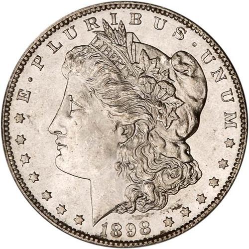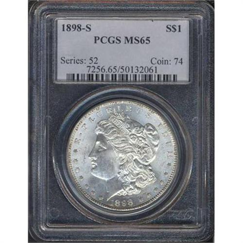 <b>1898-S Morgan Dollar. PCGS graded MS65.</b> A problem-free 1898-S Morgan bursting with luster, vivid and white in appearance. What's more, the surfaces acquit themselves nicely in terms of the fewness of marks. According to our observations, including the key highpoints of hair on the obverse and the breast feathers on the reverse, the strike is above-average, in fact sharp, in all areas. Thoroughly pleasing Gem quality <b>(PCGS # 7256)</b>