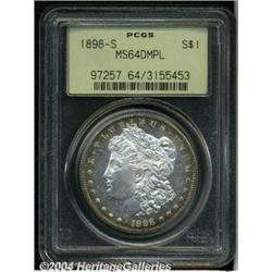 <B>1898-S<S$1> MS64 Deep Mirror Prooflike PCGS.</B></I> A peripheral ring of golden-brown toning lends originality to the obverse side. The nicely mirrored fields show a few small marks. <BR><BR><B>Important notice:</B> Heritage usually auctions material at the rate of 200-250 lots per hour. On some occasions eBay Live bid software or the Internet may not be able to keep up with the pace of the auction. We recommend placing a realistic absentee bid now as insurance to avoid disappointment. Occasionally the auctioneer may eliminate or reject an eBay Live bid, and the auctioneer may also reopen a lot after the close of the eBay live bidding (usually because we missed an audience bid), and may reject your bid even if it shows you as the winning bidder. By bidding via eBay Live, you agree that Heritage may award the lot to another bidder at its sole discretion under the circumstances described above or any other reasonable circumstances. Since eBay bids are not shown to us until we open the lot on the floor, we treat those bids just like floor bids. In most cases the floor responds before the eBay bid is presented to us, due to Internet lag time, so for consistency we have made it a policy that floor bids are always considered first over tie eBay live bids. Also please note that all Heritage lots purchased through eBay Live carry a 20% Buyer's Premium. Please make sure you read the Terms and Conditions before you bid.